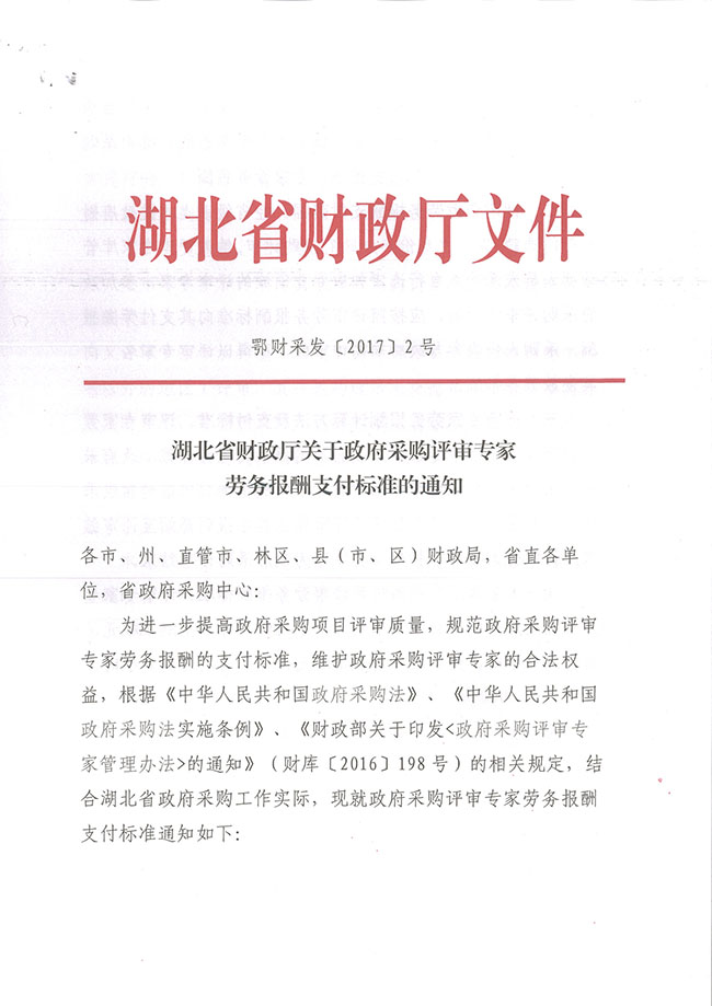 湖北省財政廳關于政府采購評審專家勞務報酬支付標準的通知鄂財采發(fā)〔2017〕2號